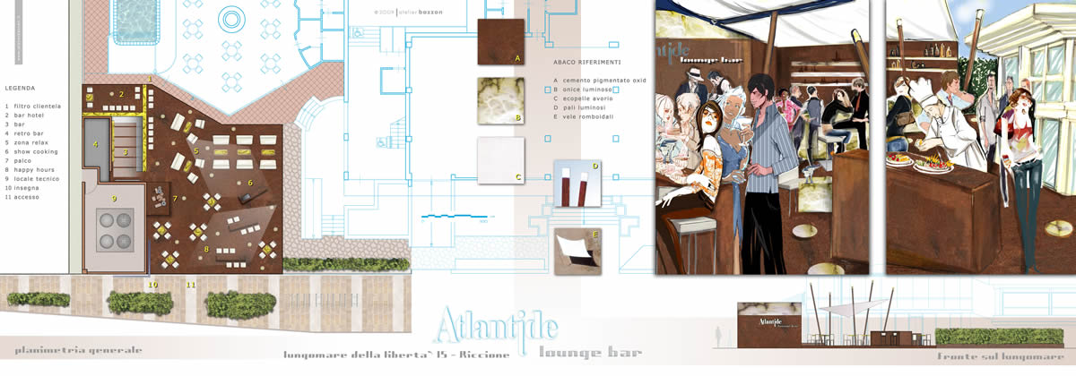 Affacciato al lungomare pedonale di Riccione, il progetto di questo Lounge Bar nasce come ampliamento dell’Atlantic Hotel come ulteriore spazio all’aperto in relazione alla esistente piscina con acqua di mare ed il noto ristorante, ad utilizzo della clientela. Durante le ore serali lo spazio si trasforma in un Lounge bar indipendente con cooking-show e musica, area privè ed accesso diretto dalla passeggiata. Il tutto poggia su di una piattaforma in Cls agli ossidi color ruggine che ospita manufatti in lastre di Onice luminoso, teli tesi ed arredi in pelle color avorio ed inox di derivazione nautica. Lo studio dell’illuminazione generale è caratterizzato da pali ruggine di ViaBizzuno.