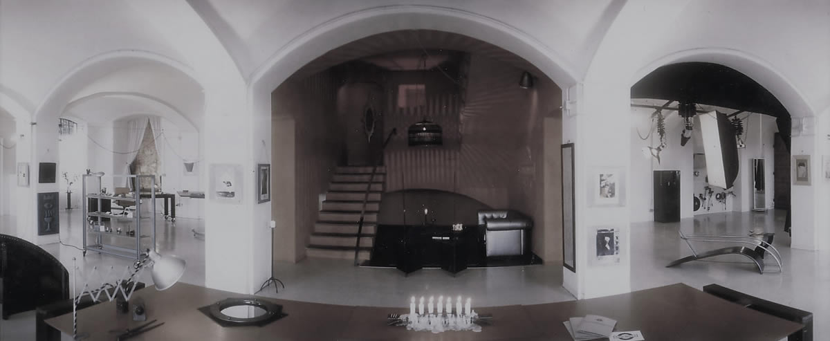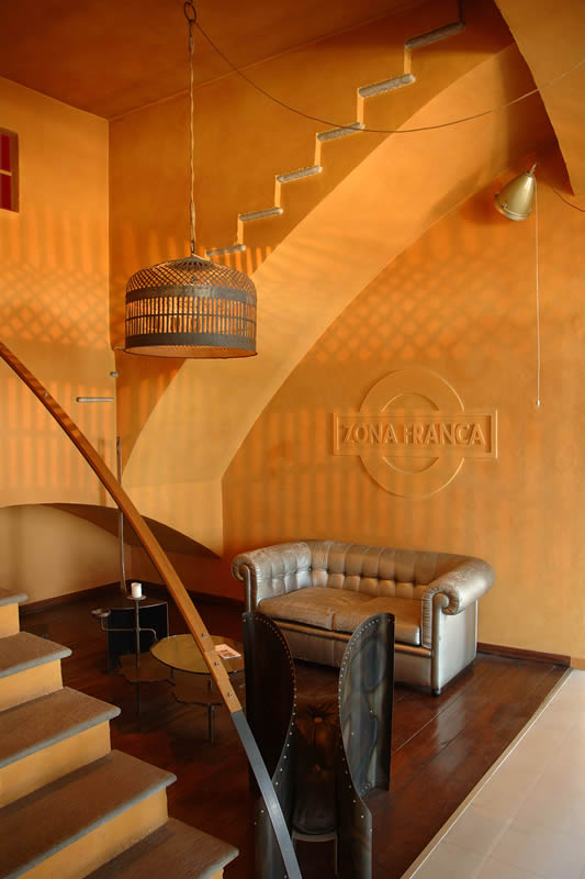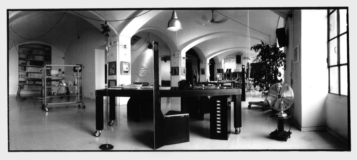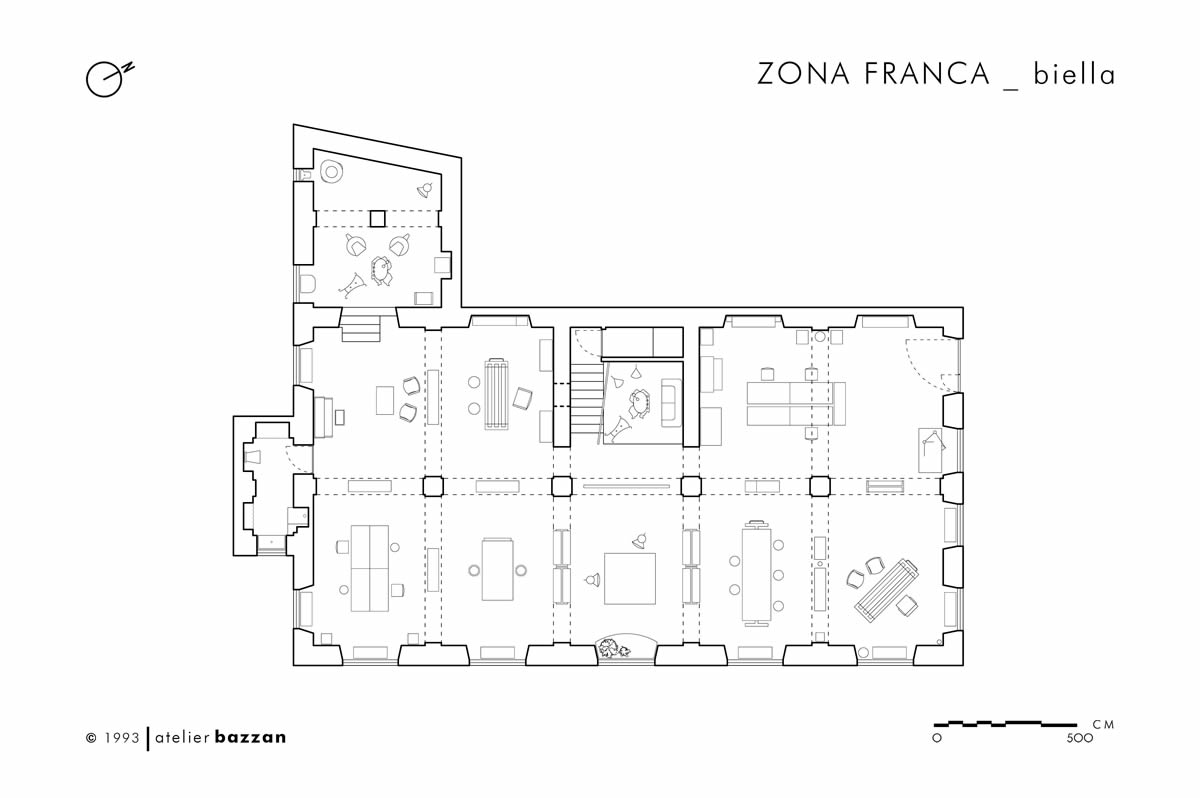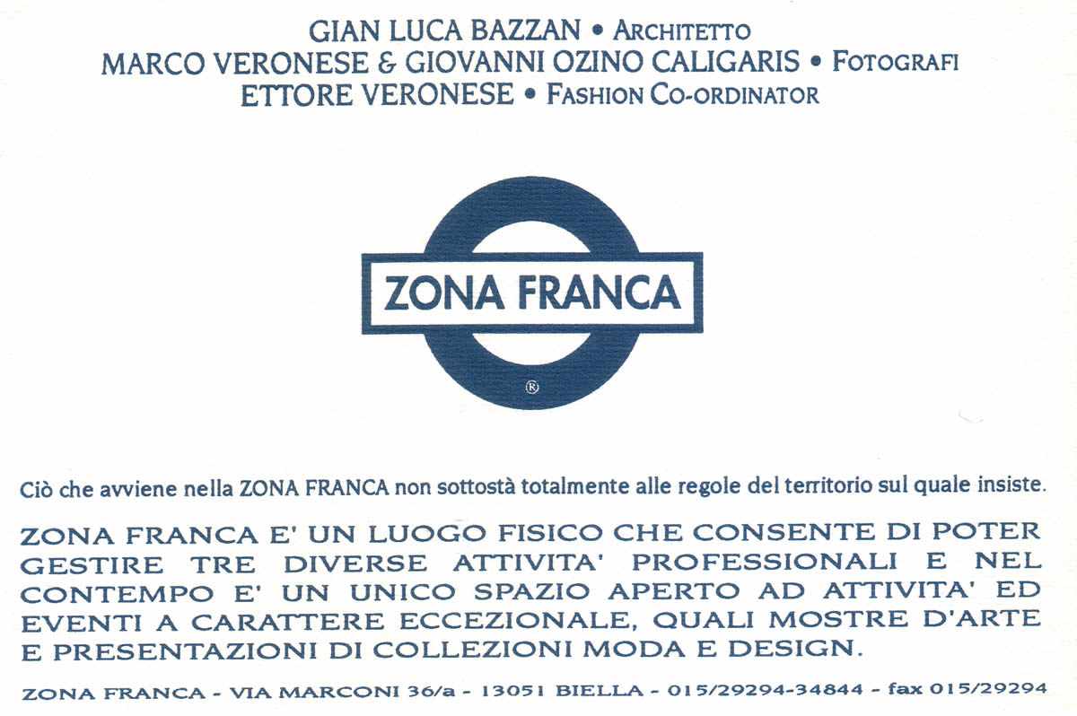 Inaugurato il 19 giugno 1993 con il nome ZONA FRANCA, lo spazio prevedeva la compresenza di tre diverse attività professionali all’interno di un unico progetto allestitivo caratterizzato dal recupero di un intero piano di un vecchio fabbricato industriale in Biella risalente alla metà dell’8OO, situato lungo la linea di demarcazione tra il centro cittadino e la zona storicamente caratterizzata da insediamenti industriali tessili lungo il torrente Cervo.