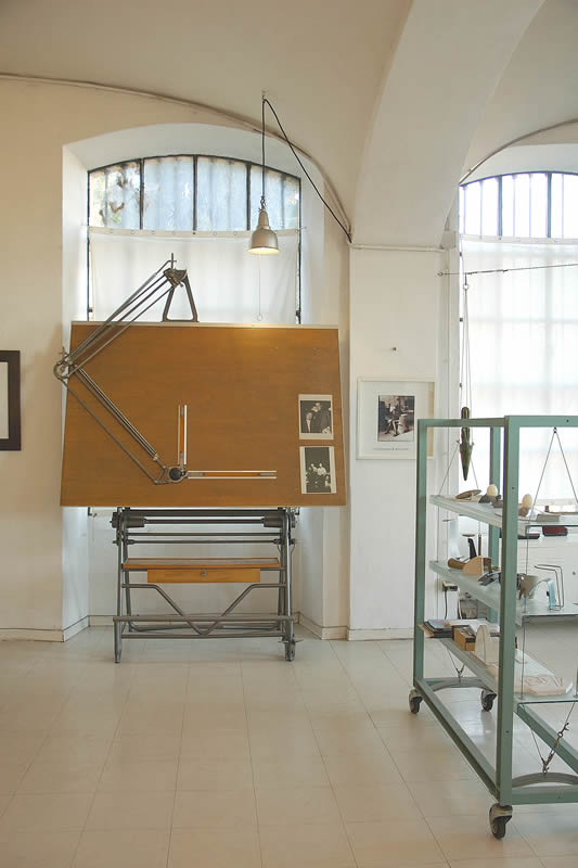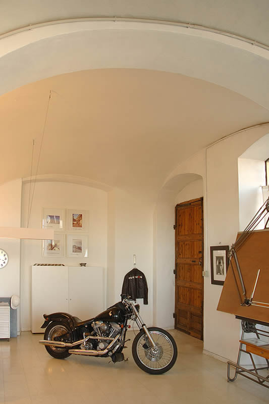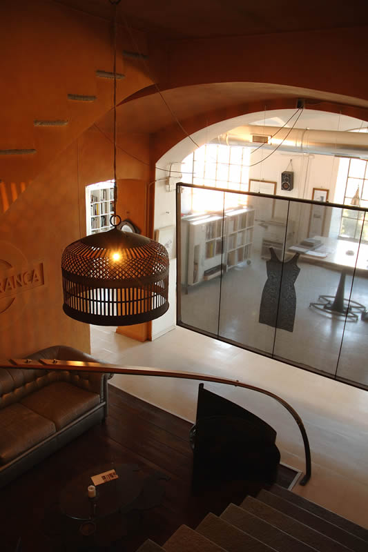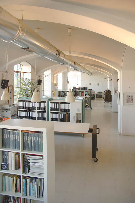 Lo spirito proprio dell’Archeologia Industriale è marcato da ampie finestrate lungo tre lati, ingresso carraio e presenza di volte a padiglione. Queste ultime concorrono, grazie al loro modulo di 5x5 metri alla definizione di diversi ambiti di lavoro, a loro volta articolati da elementi di arredo fissi e mobili disegnati su misura alternati a prototipi e pezzi di design storico.