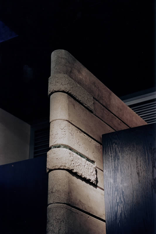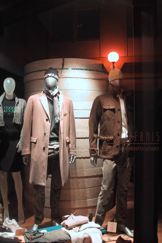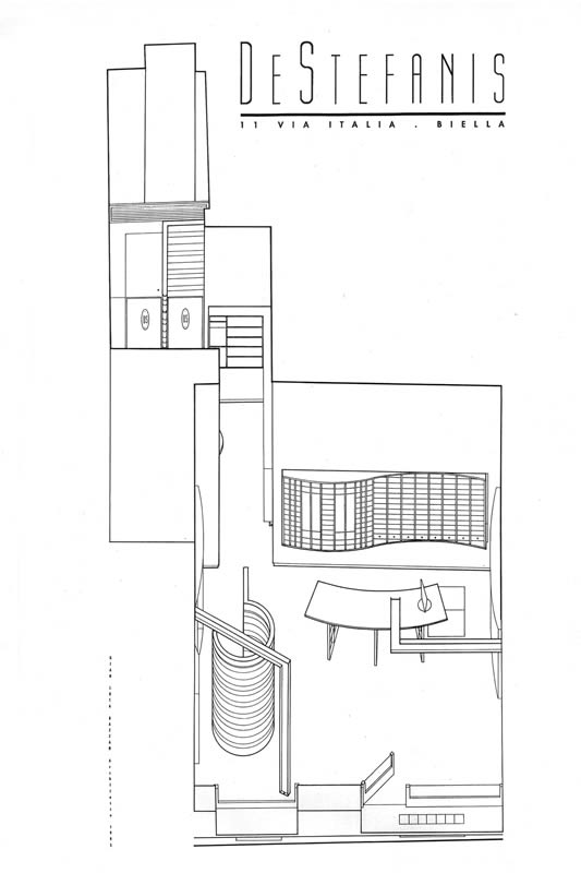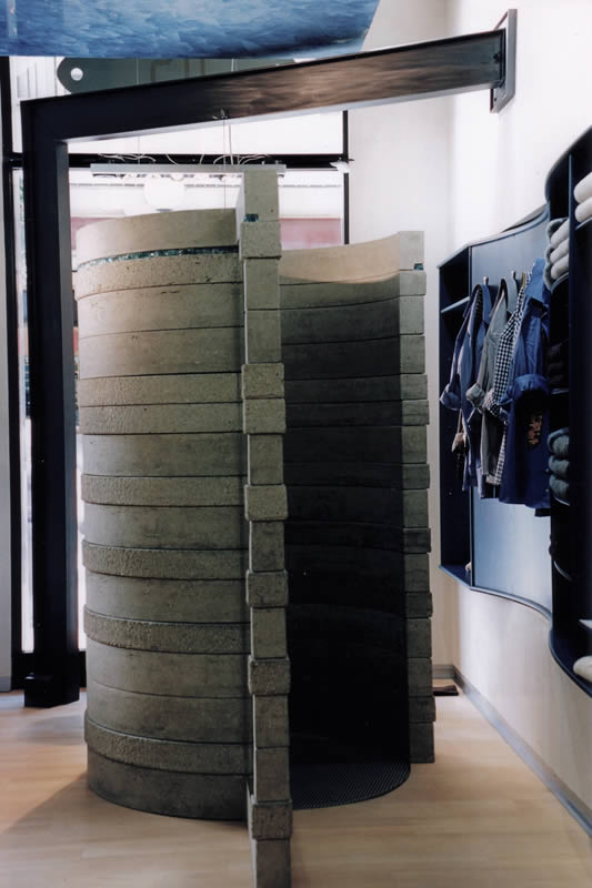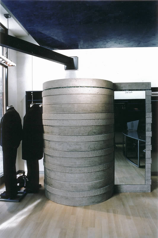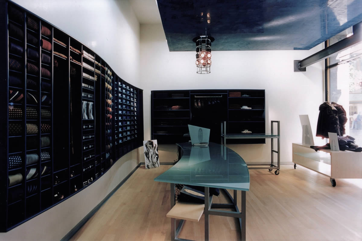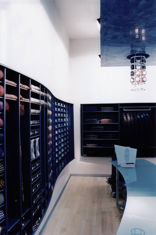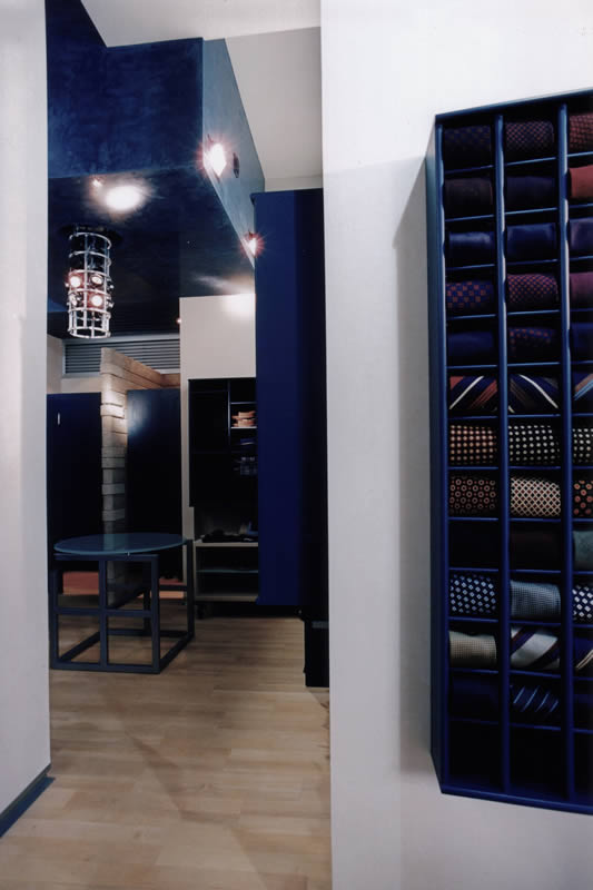 La rigorosità formale caratterizza questo negozio di abbigliamento per l’uomo, situato nella centrale via Italia. Pochi oggetti dalla geometria definiti collocati nello spazio ne determinano la ripartizione. Un ligneo nastro blu ondeggia orizzontalmente apparendo e contrapponendosi nel lucido muro color avorio. Due cupi parallelepipedi blu gravano dall’alto quali metafora di cielo solido.