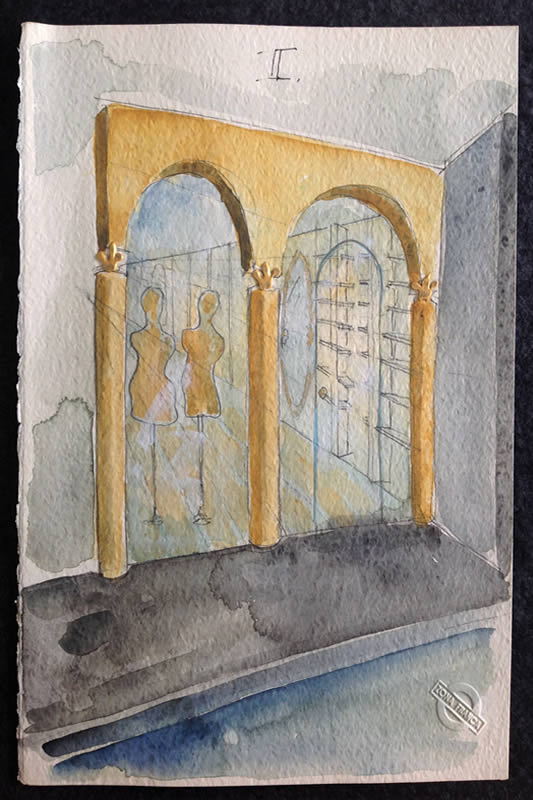 L’incontro tra l’utilizzo dei materiali naturali francesi quali la pietra, il ferro, il vetro ed un ricco repertorio di forme tradizionali italiane dà vita ad un forte spazio scenico incentrato sulla visione prospettica centrale, preannunciata dai tre archi di facciata.