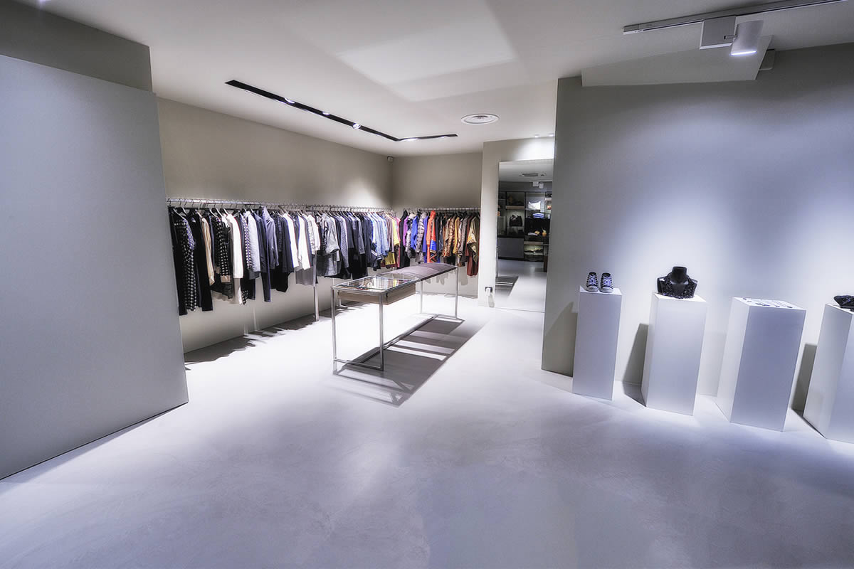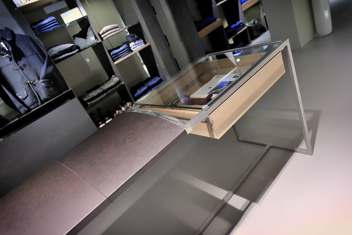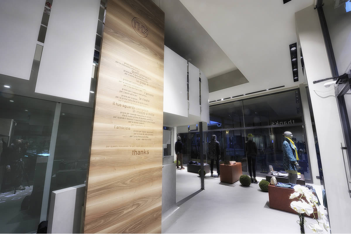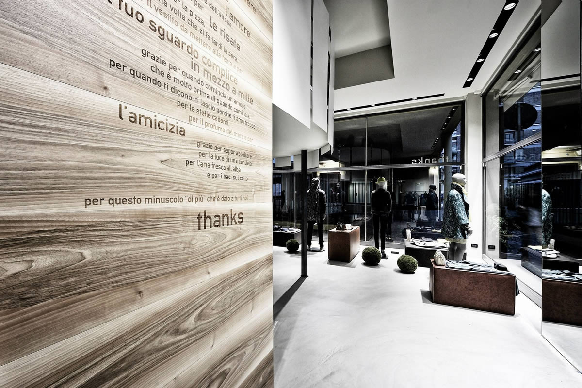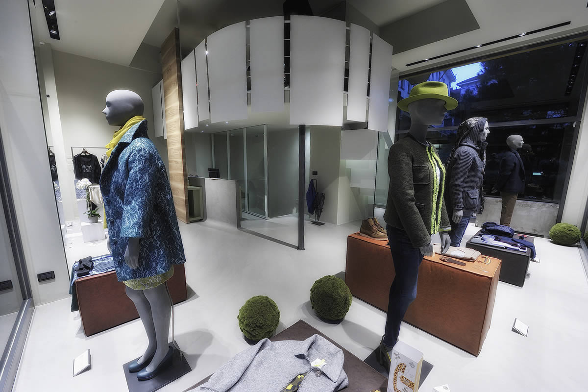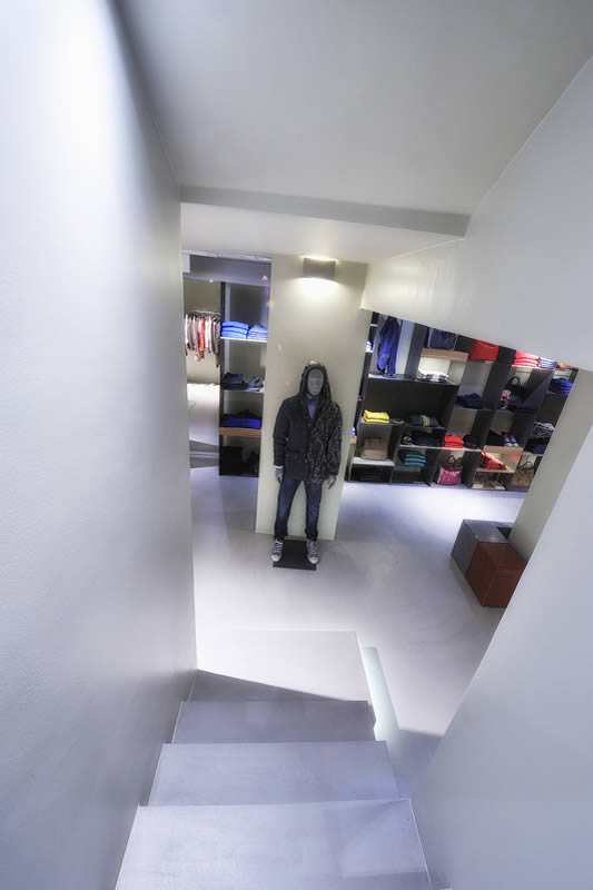 Lo spazio disposto su tre livelli, si presenta inizialmente come un'ampia teca in vetro a filo strada contenente un articolato volume angolare che accentra le funzioni distributive e contenitive. Sorta di spazio scenico in continuo divenire, funzionale alla presentazione delle proposte di abbigliamento, accessori ed oggetti oltre ad ospitare mostre ed eventi.