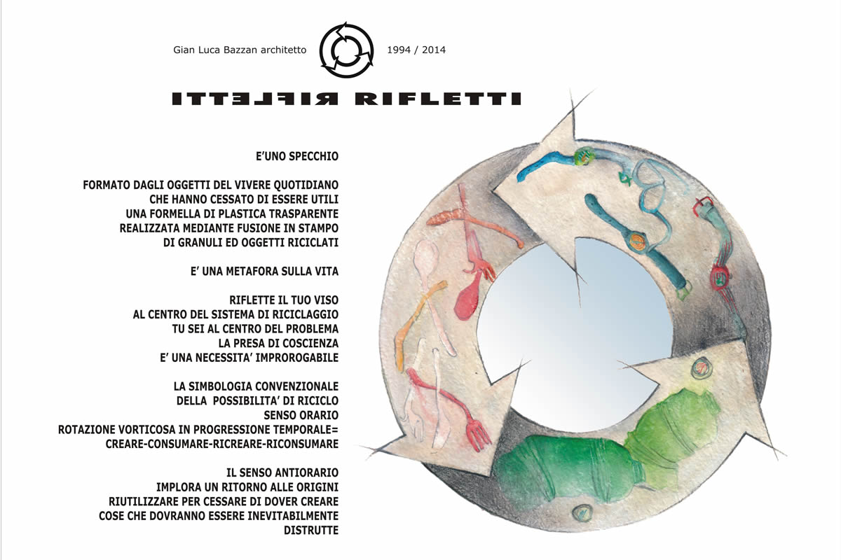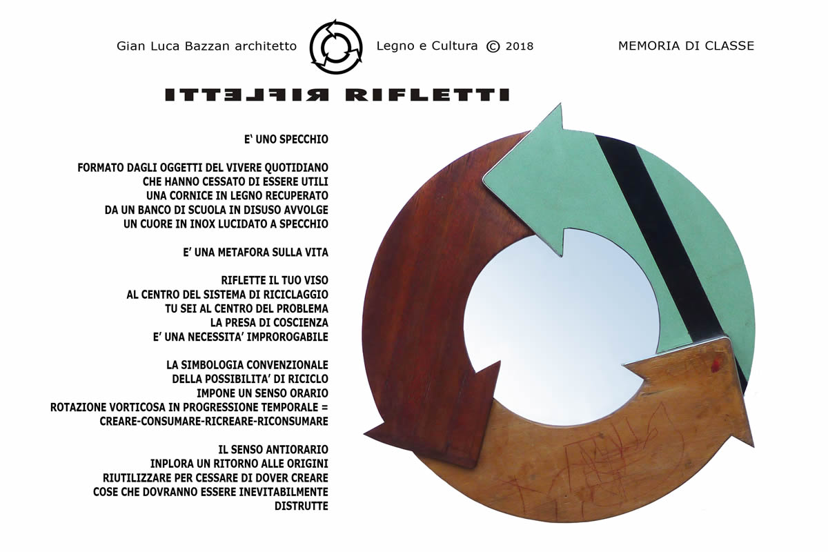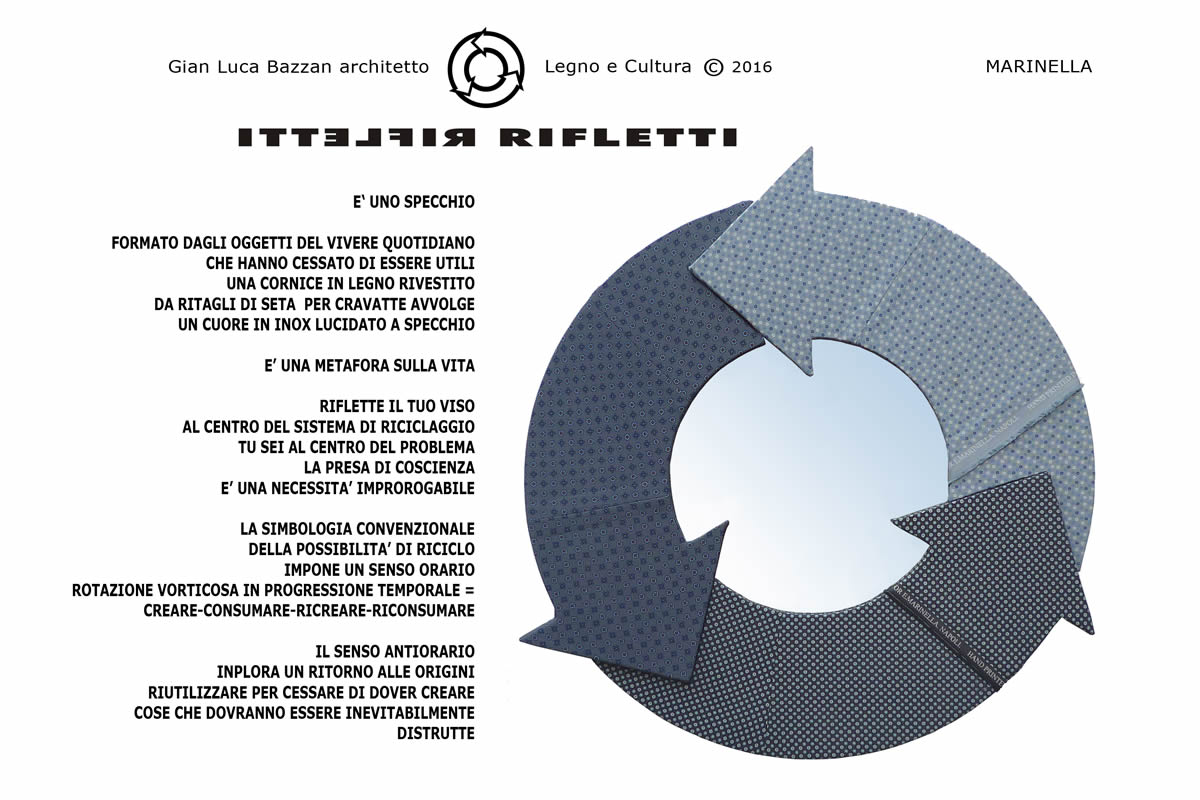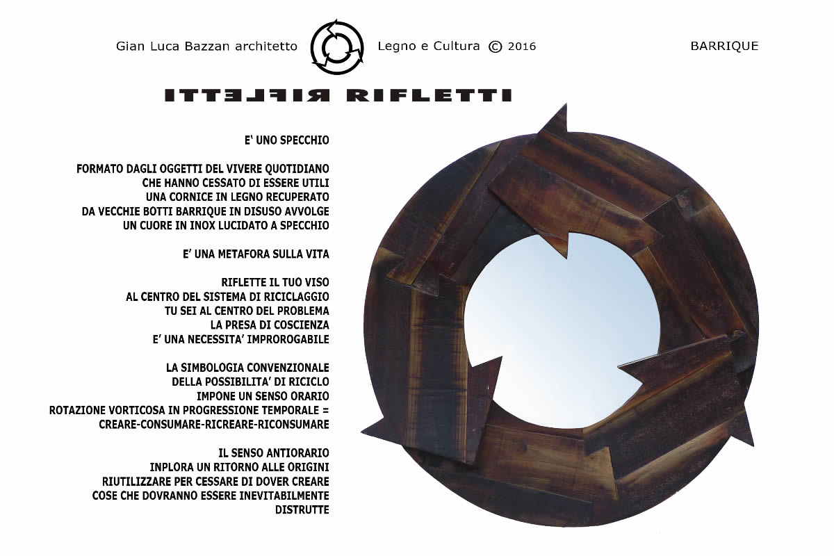 Lo specchio RIFLETTI pone al centro della questione Riuso/Riciclo il viso del fruitore che non può considerarsi al di fuori di una necessaria riflessione sui significati e ricadute della produzione di massa. Gli oggetti sono realizzati con materiali eco-friendly ed assemblati secondo gli alti standard qualitativi a cura del Maestro d’arte Roberto Monteferrario titolare del marchio biellese Legno e Cultura su disegno dell’Arch. Gian Luca Bazzan. La collezione in progress si compone ad oggi delle seguenti versioni: BARRIQUE - in legno proveniente dallo smantellamento di botti Barrique che hanno completato il loro ciclo vitale e che è caratterizzato dalle tonalità cromatiche e dal profumo dei vini che hanno ospitato. TRAVA’ - In legno proveniente dallo smaltimento di travi e soffitti in legno. MARINELLA - con ritagli di prezioso tessuto in seta per cravatte proveniente dallo storico laboratorio E.Marinella di Napoli. MEMORIA DI CLASSE - realizzato con un vecchio banco da scuola in legno e laminato. La superficie specchiante è realizzata in acciaio inox.