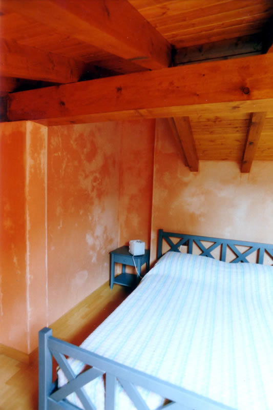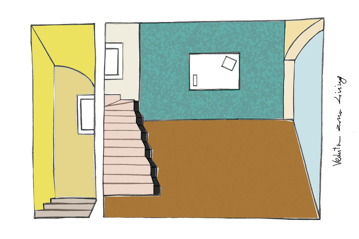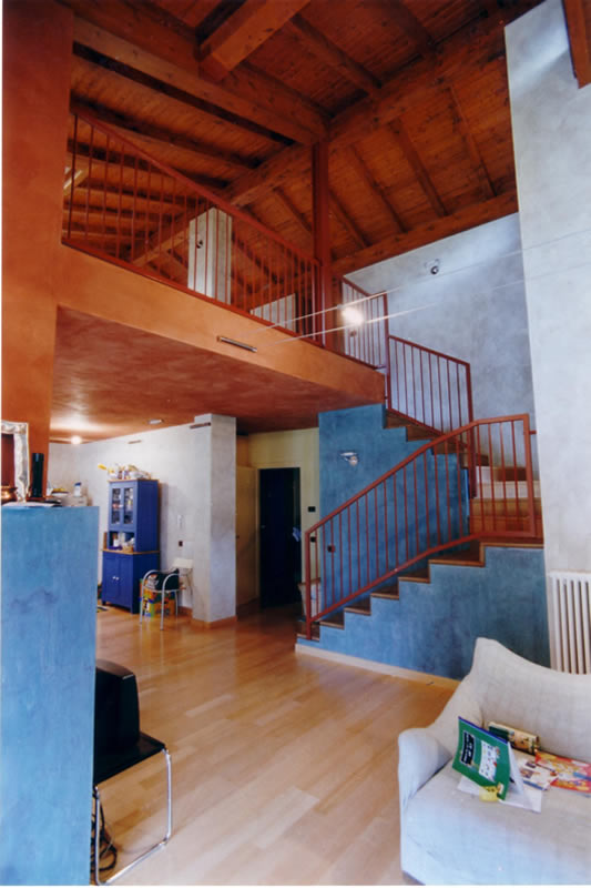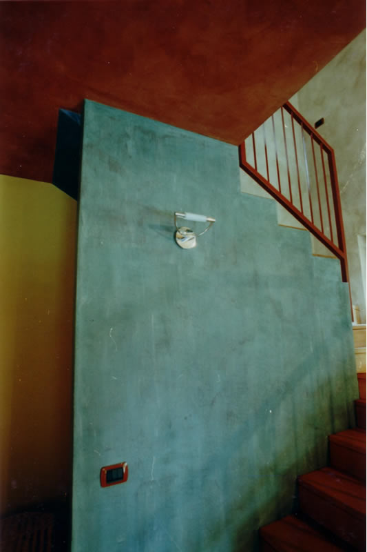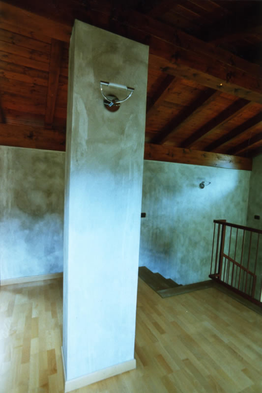 Collocata a ridosso della Rocca di Castelveccana sul Lago Maggiore a mezza via tra Varese e Luino, questa casa per le vacanze si presenta come una recente architettura anonima. Laddove non era possibile, né richiesto modificare lo spazio attraverso l’inserimento di nuove forme, si è optato per l’utilizzo del Colore quale strumento indagatore dello spazio. Colore che rivela ed esalta i volumi divenendo Architettura e non inteso come piatta campitura a rivestimento di superfici. Punto di mediazione tra interno ed esterno è rappresentato dallo spazio porticato, in questo luogo, posto a prolungamento delle zone living e cucina, i materiali e colori usati internamente escono e si interscambiano con quelli esterni che invece entrano. Il risultato è la creazione di una sorta di “stanza aperta” verso il giardino. L’intervento si è concretizzato grazie all’uso di un particolare trattamento di finitura delle pareti, a base di un composto minerale dominato dall’Alabastro. Questa finitura, assieme a una forte componente cromatica, permette di evidenziare un alto grado di matericità, essa si rivela nella presenza di una tipica texture data dalla grana del materiale e dal suo continuo mutare aspetto in funzione delle caratteristiche del supporto sul quale è steso.