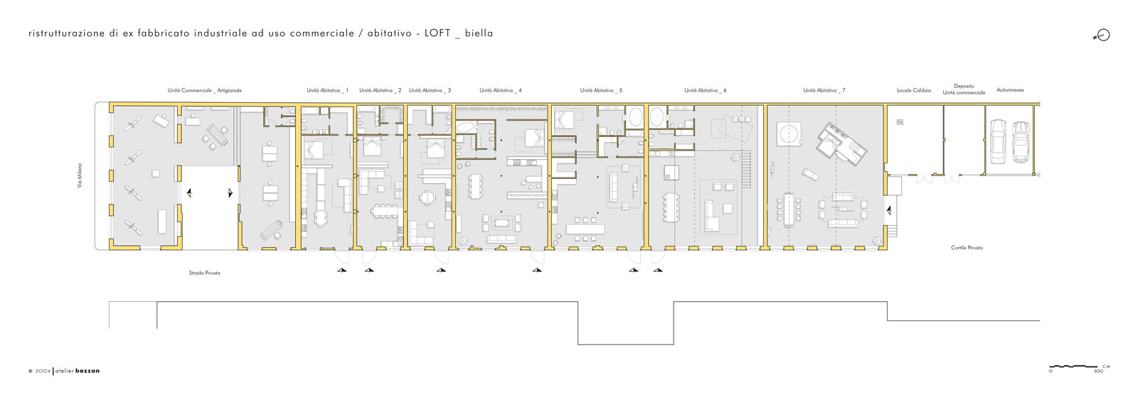 Il progetto qui illustrato, riguarda la riconversione ad uso Residenziale di un fabbricato Industriale situato alle porte di Biella, a ridosso del futuro Parco Fluviale lungo il torrente Cervo. Esso si colloca all’interno del contesto tipico dell’Archeologia Industriale, coniugandosi con i più recenti criteri realizzativi della tipologia ad open-space denominata Loft. Il Progetto prende in considerazione varie possibilità di intervento proponendo la suddivisione in differenti pezzature, senza tuttavia venire meno alle dimensioni minime che li connotano. Gli spazi ricavati vengono così risolti tramite la disposizione di oculati elementi di arredo aventi la funzione di Organizzatori Spaziali per ciò che concerne le pezzature base, passando per la definizione ad Open-space delle superfici intermedie caratterizzate dalle volte a Shed sorrette da colonnine in ghisa, fino ad arrivare alla definizione di un unicum spaziale organizzato tridimensionalmente mediante la collocazione di un MODULO ABITATIVO dalle contenute dimensioni, ma raggruppante le essenziali funzioni vitali di un’abitazione (cucina, bagno, camera da letto) operando in tale modo lo svincolo della restante superficie abitativa che verrà utilizzata quale sorta di scenografia urbana senza essere snaturata dagli aspetti formali che ne hanno determinato la scelta.