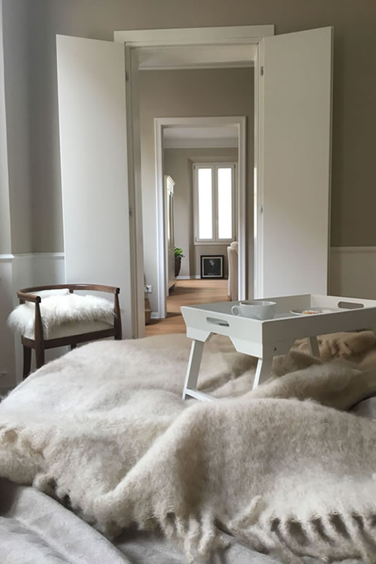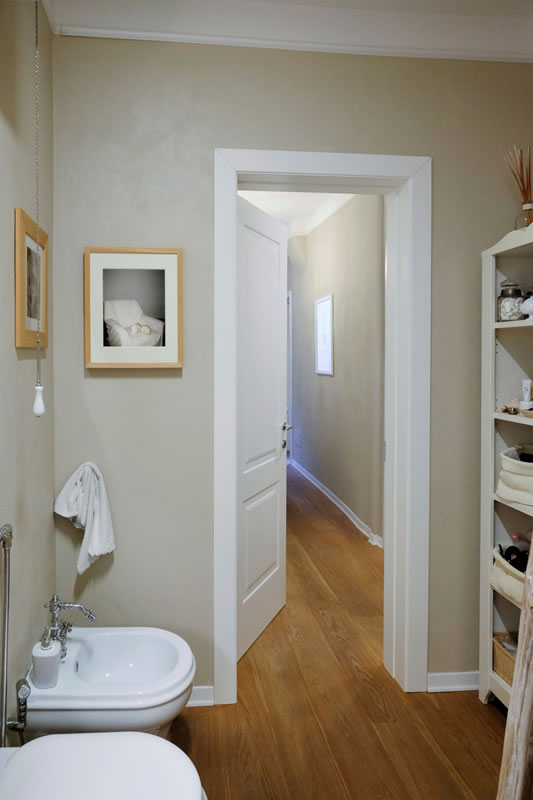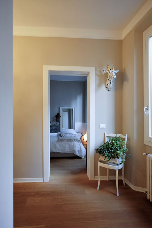 Tutti gli ambienti sono vestiti di toni caldi e chiari alle pareti che poggiano su di un unico parquet in legno.