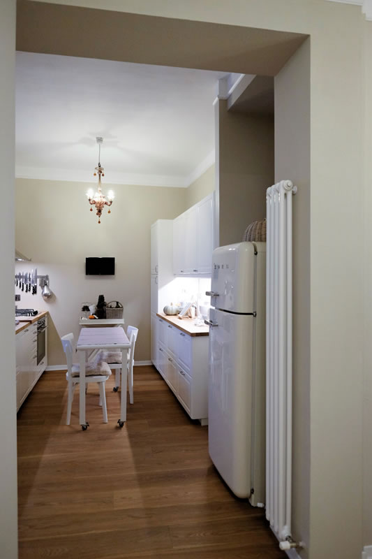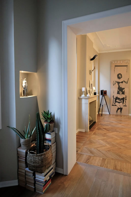 La coincidenza dell’intervento di recupero dello stabile con i lavori che hanno interessato il piano superiore, anche esso ad uso abitativo ed occupato da una coppia di amici, ha permesso di definire una armonia estesa sin dall’androne di ingresso, personalizzato dall’esposizione di opere fotografiche dello stesso proprietario.