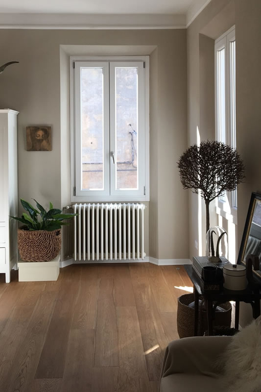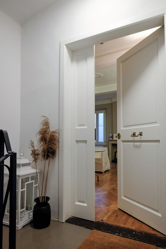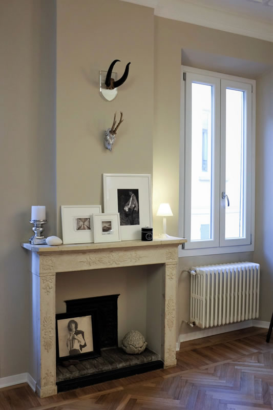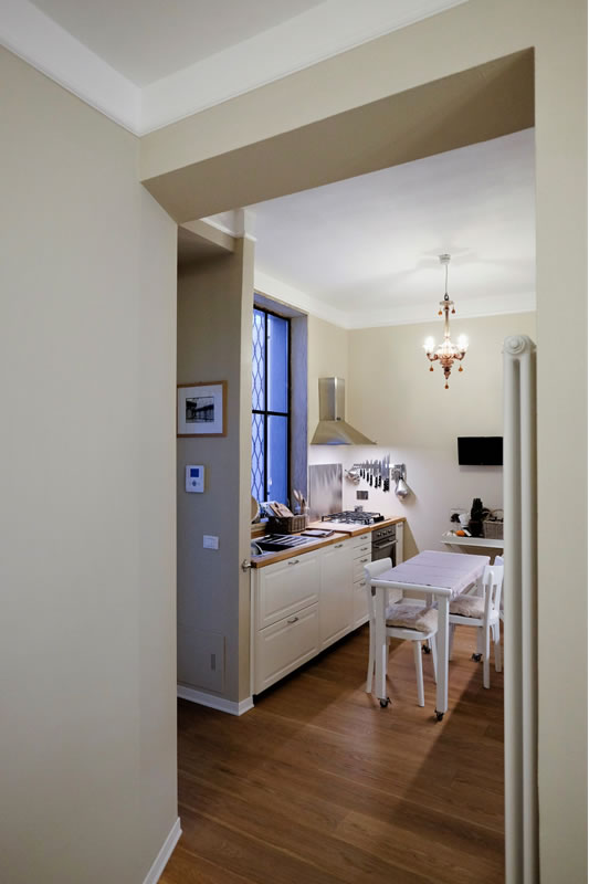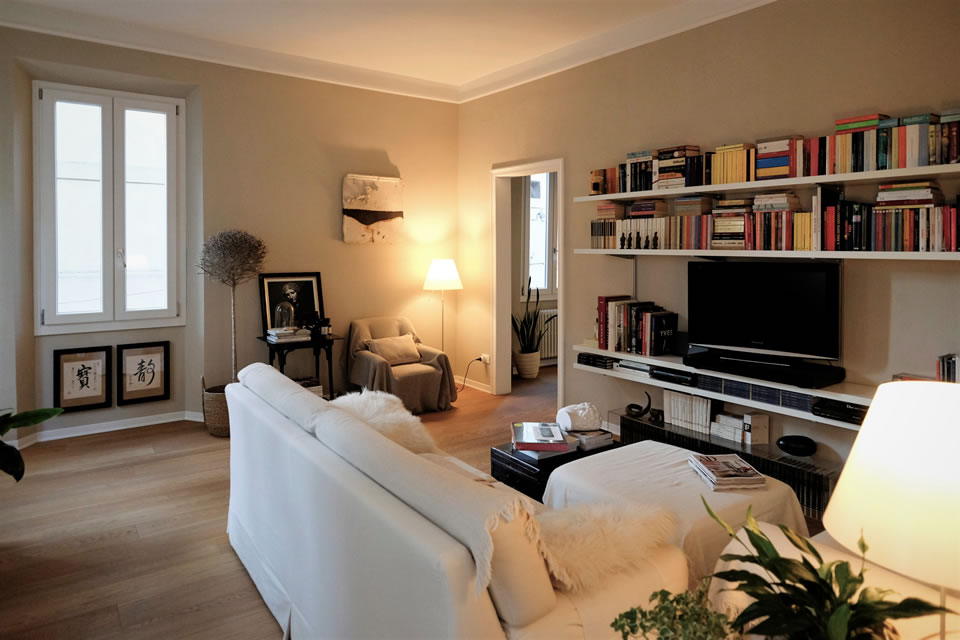 L’abitazione realizzata per una coppia emiliana occupa il primo piano di un palazzo posto a fianco della Basilica di San Prospero nel vitale centro di Reggio Emilia.